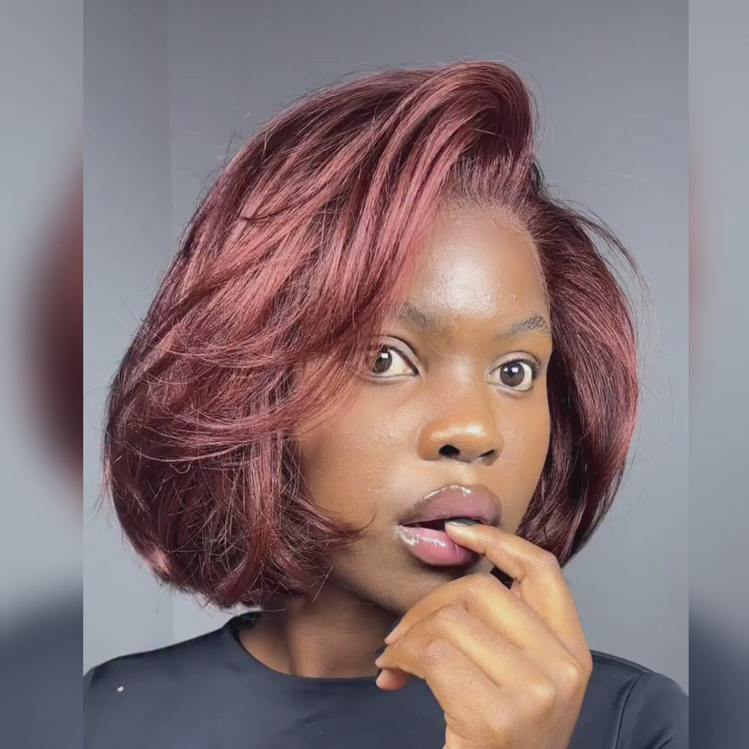 Auburn Red End Curl Bob Wig Layered Raw Human Hair Blow Style Lace Front Wig - Rafarada