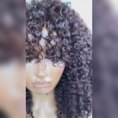 Glueless Chocolate Brown Afro Small Curly Wig with Bangs 6x4 Lace Ombre Brown Human Hair Wigs Bouncy Jerry Curl Fringe Wig Pre-Plucked & Beginner Friendly - Rafarada