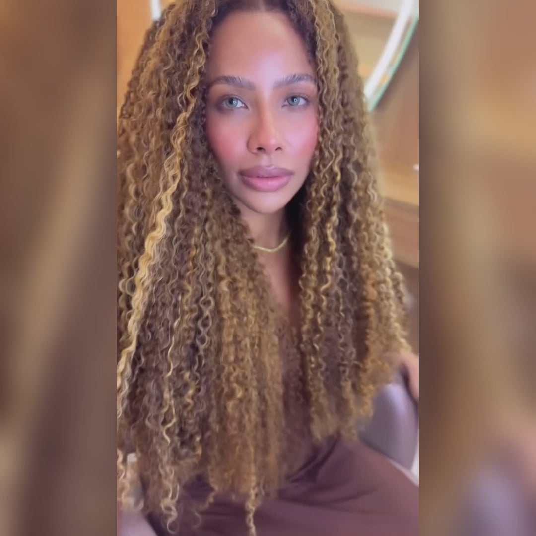 Honey Blonde Highlight Kinky Curly Human Hair Wig Glueless Lace Frontal Wig Brown Balayage Curly Wig for Women - Rafarada